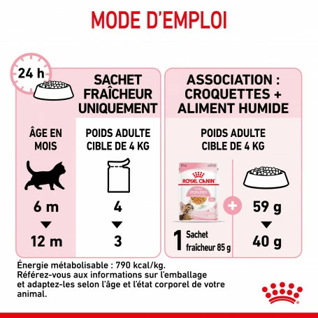 Les sachets repas Cat Kitten Sterilised Royal Canin Emincu00e9 en gelu00e9e sont spu00e9cialement conu00e7us pour les chatons stu00e9rilisu00e9s jusqu’u00e0 l’u00e2ge de 12 mois.
