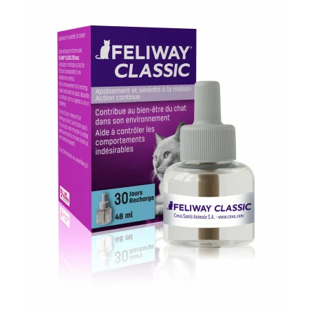 Le saviez-vous ? : Lorsquu2019un chat se sent en su00e9curitu00e9, il frotte sa tu00eate contre les objets qui se trouvent dans lu2019environnement local (meubles, coins de mur ou rideaux), du00e9posant des substances appelu00e9es phu00e9romones faciales. Ces phu00e9romones sont spu00e9cifiques aux chats, indu00e9tectables par l’homme et d’autres animaux, et vu00e9hiculent un message de su00e9curitu00e9, du2019apaisement et de bien-u00eatre. FELIWAYu00ae Classic est une reproduction synthu00e9tique de cette phu00e9romone faciale, reconnue pour ses propriu00e9tu00e9s rassurantes et ru00e9confortantes.