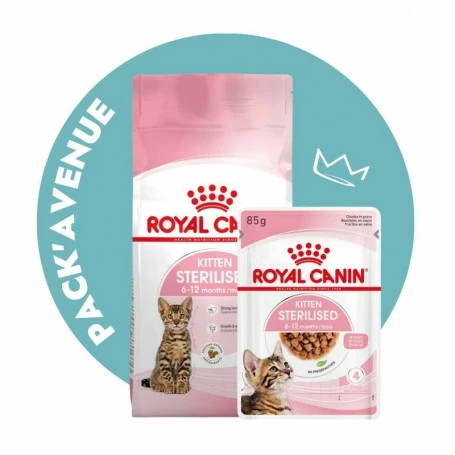 Du00e9couvrez le Pack Royal Canin de croquettes Cat Kitten Sterilised Royal Canin avec des sachets repas conu00e7u pour aider u00e0 la croissance et la gestion du poids de votre chat de 6 u00e0 12 mois.